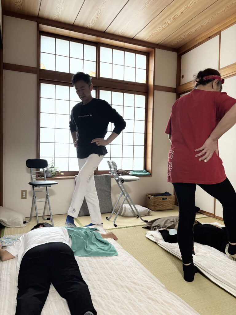 実際に谷川先生を踏む(足圧する)ことで技術チェックされます。